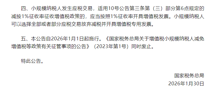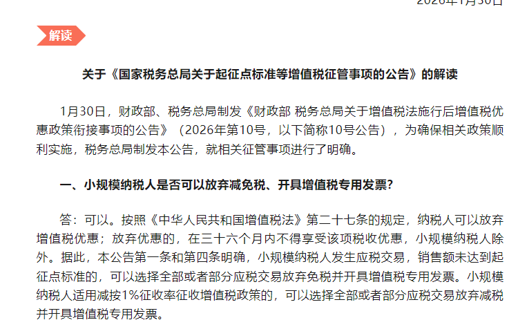 2026年1月1日起,《中华人民共和国增值税法》及其实施条例正式施行。近日,财政部、国家税务总局联合制发《关于增值税法施行后有关优惠政策衔接事项的公告》,对增值税法规定的起征点标准予以细化明确。在此基础上,税务总局配套制发了《关于起征点标准等增值税征管事项的公告》(以下简称《征管公告》),就起征点标准判定、税收优惠政策适用等增值税征管事项作了进一步明确,细化操作要求,推动增值税法及其实施条例落实落地。