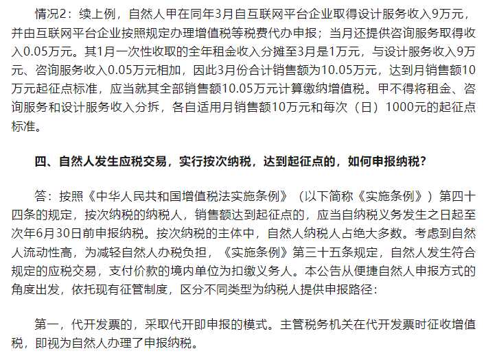 “从公告规定来看,税务部门尽量减少了自然人需要自行申报纳税的情况。”黄立新表示,“如果自然人代开发票、代扣代缴两种方式都未涉及,才适用兜底方式,就其本年度尚未缴纳增值税的应税交易,按照规定向主管税务机关申报纳税,这样就减轻了自然人的办税负担。”