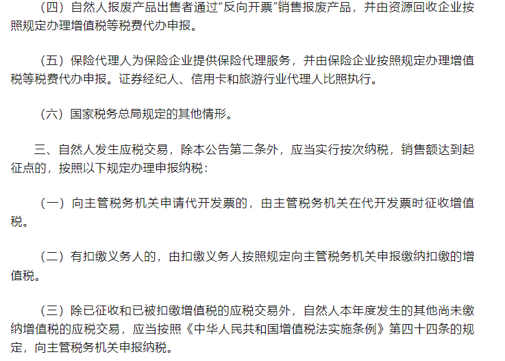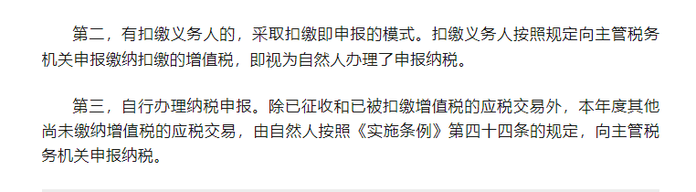 “从公告规定来看,税务部门尽量减少了自然人需要自行申报纳税的情况。”黄立新表示,“如果自然人代开发票、代扣代缴两种方式都未涉及,才适用兜底方式,就其本年度尚未缴纳增值税的应税交易,按照规定向主管税务机关申报纳税,这样就减轻了自然人的办税负担。”