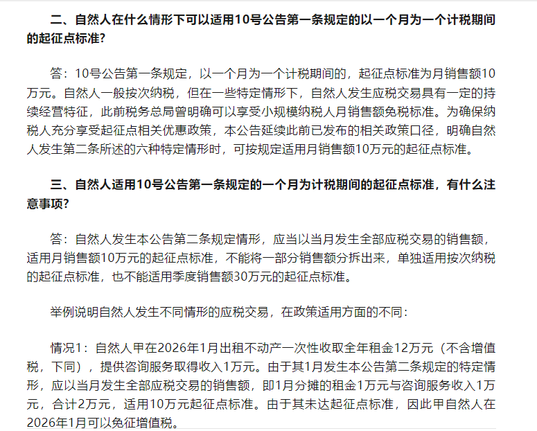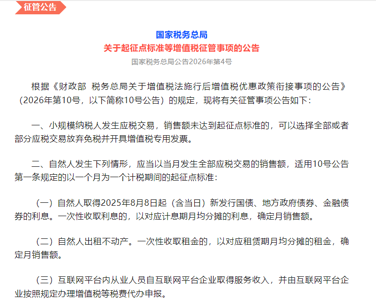 2026年1月1日起,《中华人民共和国增值税法》及其实施条例正式施行。近日,财政部、国家税务总局联合制发《关于增值税法施行后有关优惠政策衔接事项的公告》,对增值税法规定的起征点标准予以细化明确。在此基础上,税务总局配套制发了《关于起征点标准等增值税征管事项的公告》(以下简称《征管公告》),就起征点标准判定、税收优惠政策适用等增值税征管事项作了进一步明确,细化操作要求,推动增值税法及其实施条例落实落地。
